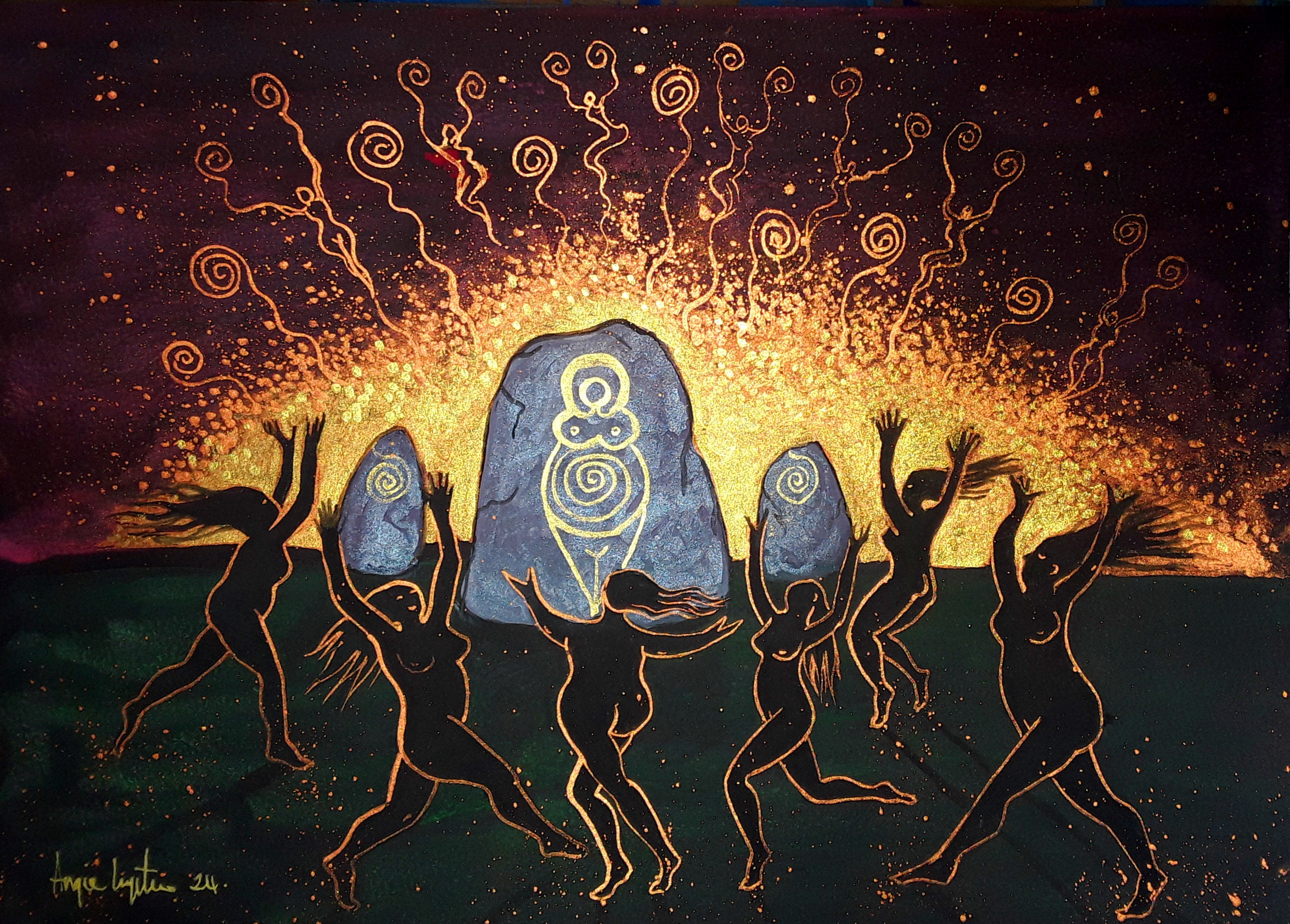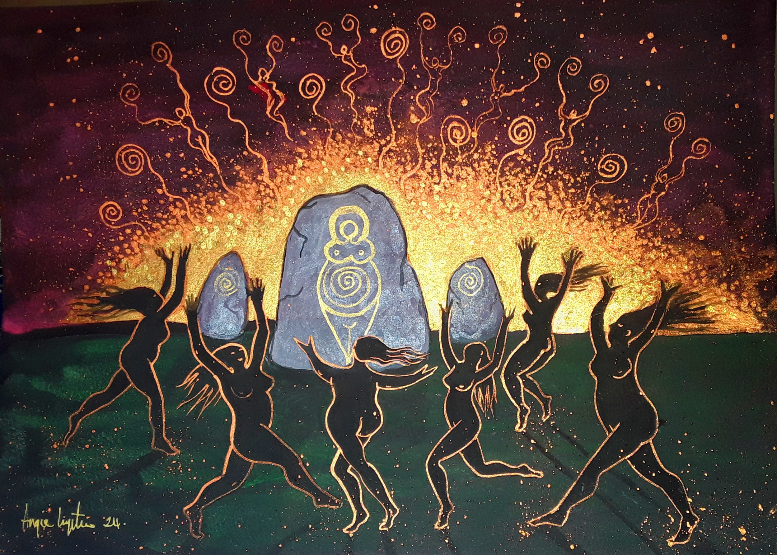 High use of metallics means this painting shimmers and sparkles in changing lights.
