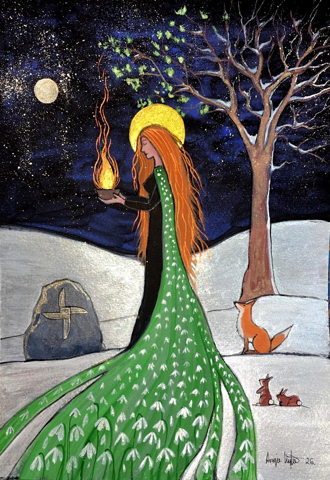 Saint Brigid, A4 print, Mystical Print, Fox, Rabbits, Winter, Spring, Snowdrops