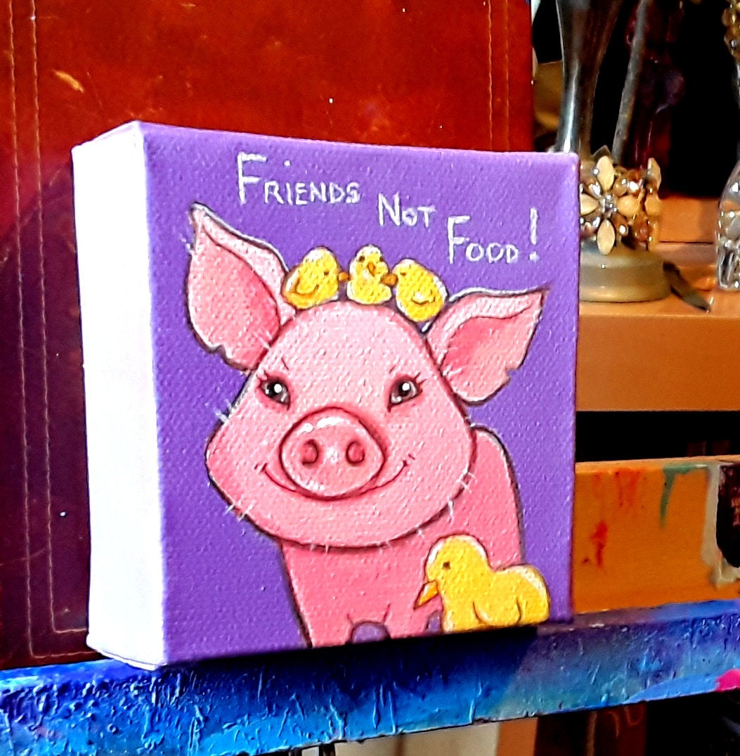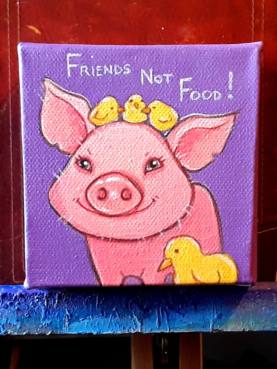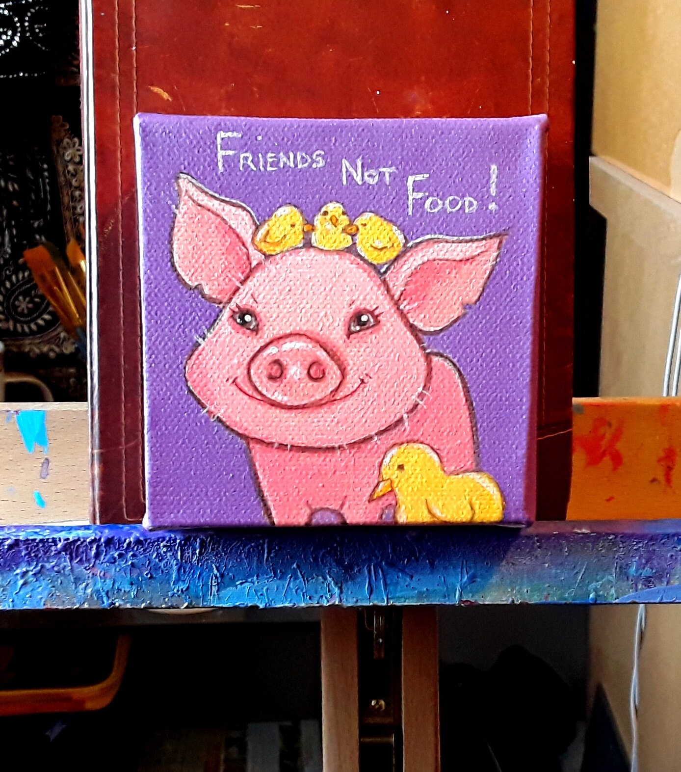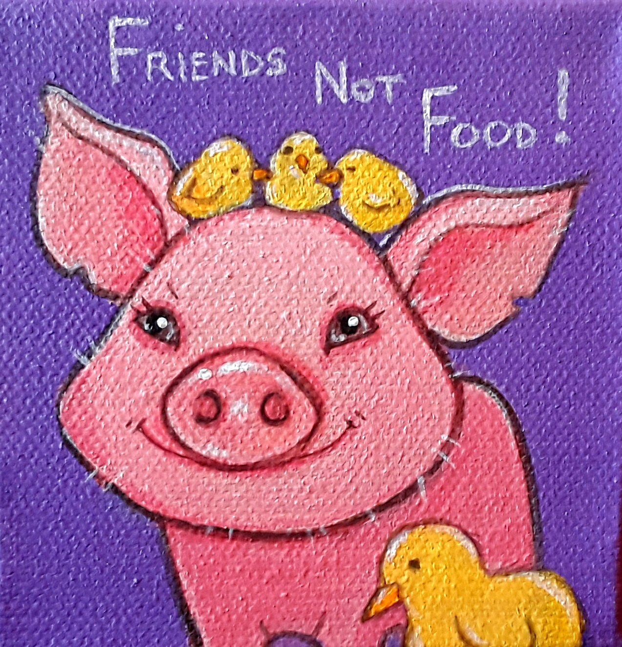 Small original painting of a piglet, baby chickens and a baby duck cuddling.